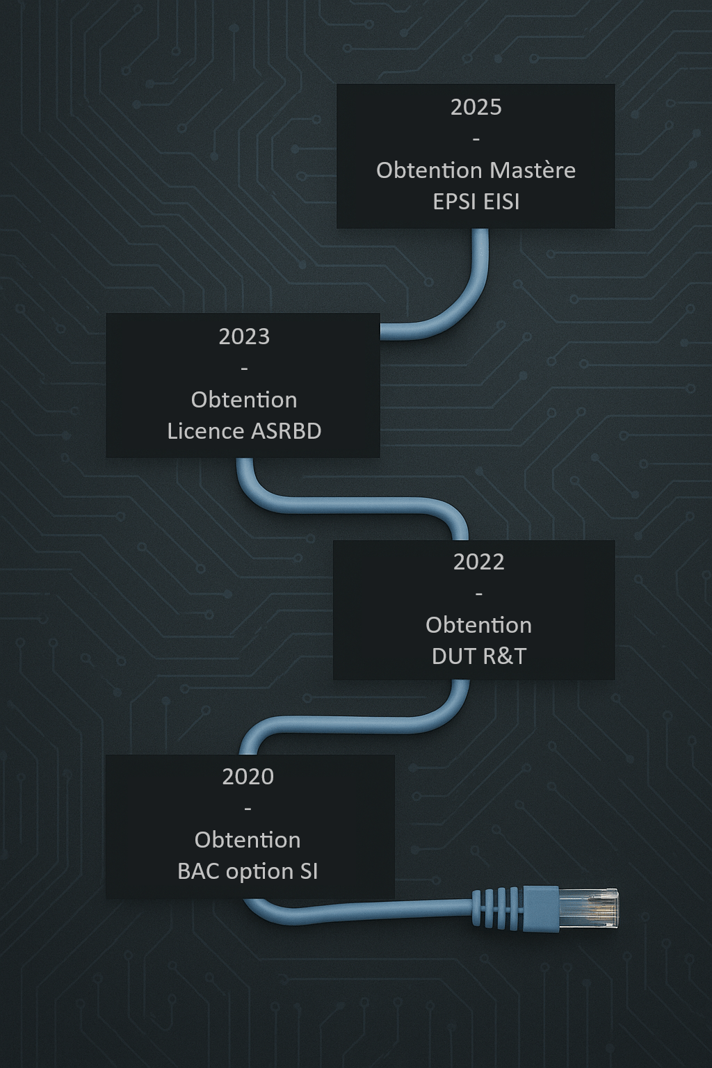À la suite d'un DUT en Réseaux & Télécommunications, j'ai effectué 3 ans au sein de l'école EPSI, ce qui m'a permis d'obtenir mon diplôme Bac+5 d'Expert en Informatique et Systèmes d'Information. Grâce à ces formations, j'ai acquis plusieurs compétences me permettant d'en faire mon métier.